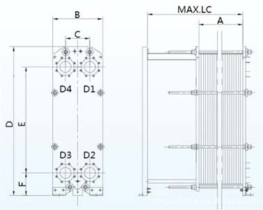 型號(hào) | A | B | C | D | E | 底端中心至地面高度F | MAX.LC | 接口通徑 | 最大片數(shù) | 最大流量 | 設(shè)計(jì)壓力 |