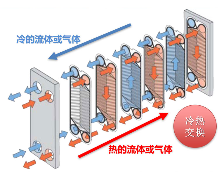 板式換熱器是由一組波紋金屬板組成,板上有四個(gè)角孔,供傳熱的兩種流體通過。金屬板片安裝在一個(gè)側(cè)面有固定板和活動(dòng)板的框架內(nèi),并用夾緊栓夾緊。板片上裝有密封墊片,將流體通道密封,并且引導(dǎo)流體交替地流至各自的通道內(nèi),形成熱交換。流體的流量、物理性質(zhì)、壓力降和溫度差決定了板片的數(shù)量和尺寸。波紋板不僅提高了湍流程度,并且形成許多支撐點(diǎn),足以承受介質(zhì)間的壓力差。金屬板和活動(dòng)壓緊板懸掛在上導(dǎo)桿,并由下導(dǎo)桿定位,而桿端則固定在支撐柱上,由于具備高性能、省空間、省能源、維護(hù)簡單等許多優(yōu)點(diǎn),板式換熱器已獲得各產(chǎn)業(yè)的高度肯定。