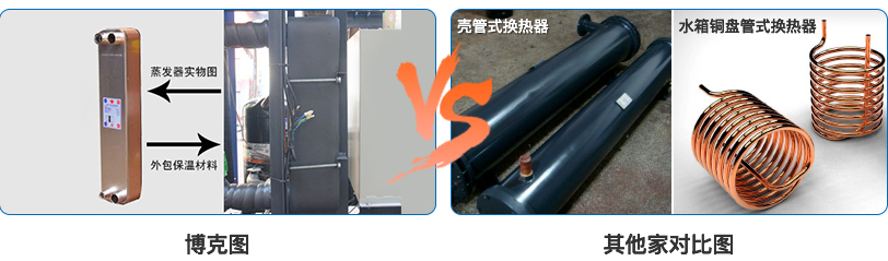 (2) 博克小型箱式冷水機部分采用銅盤管式換熱器作蒸發(fā)器,為獲取更大的制冷量,銅盤管長度比別家長一倍。
